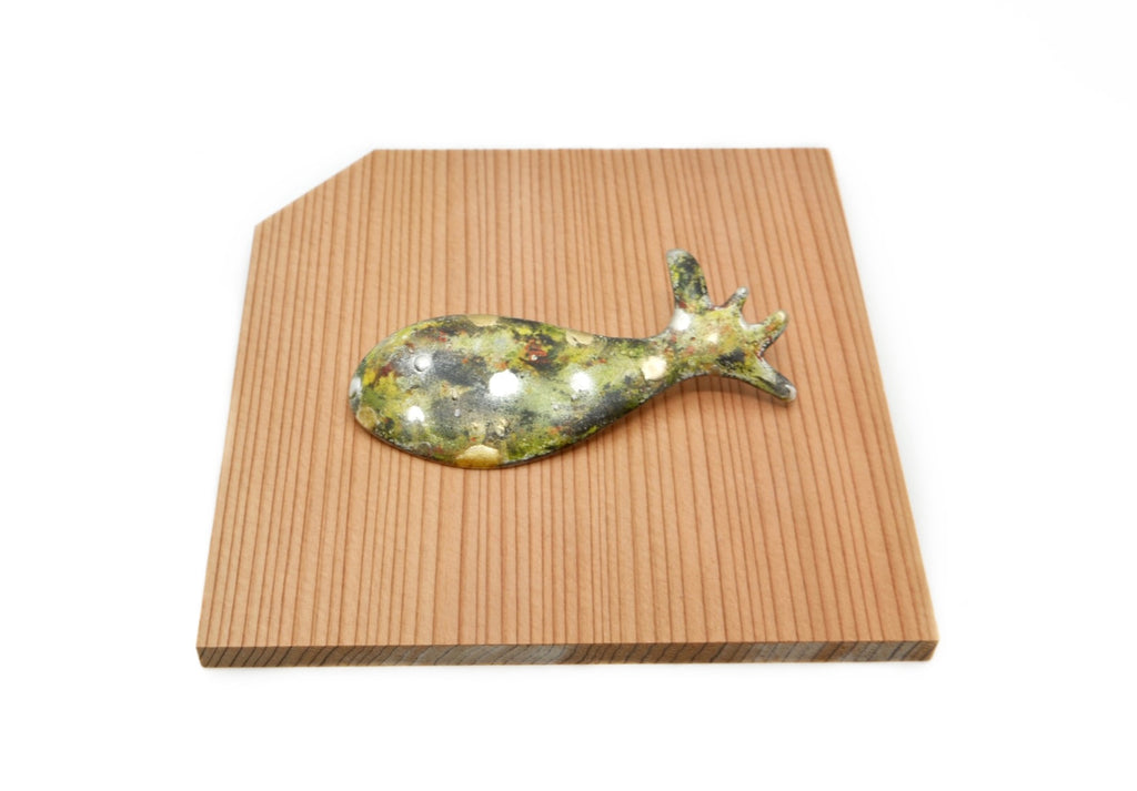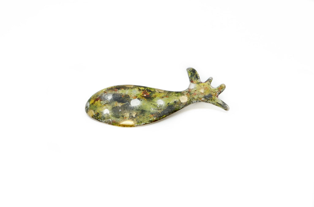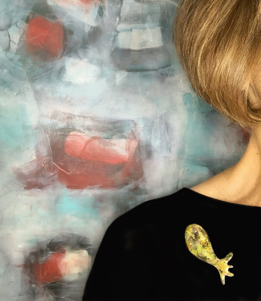 I’m always fascinated and inspired by the colour and light of sea life and look for ways to express it’s beauty in jewelry and artwork. This brooch is enameled in layers, accented with cashew lacquer and dusted with pure gold or silver powder. I like working with simple forms and creating small works of wearable art. It is carefully crafted and finished. Enjoy!