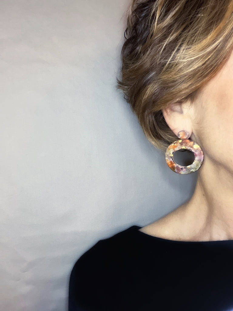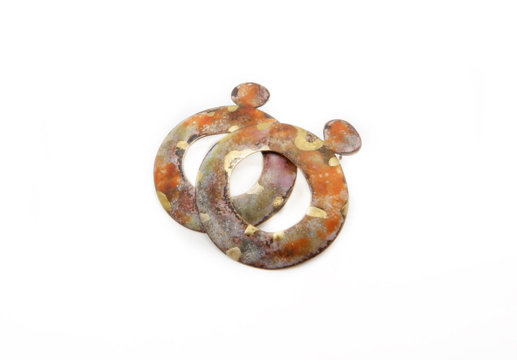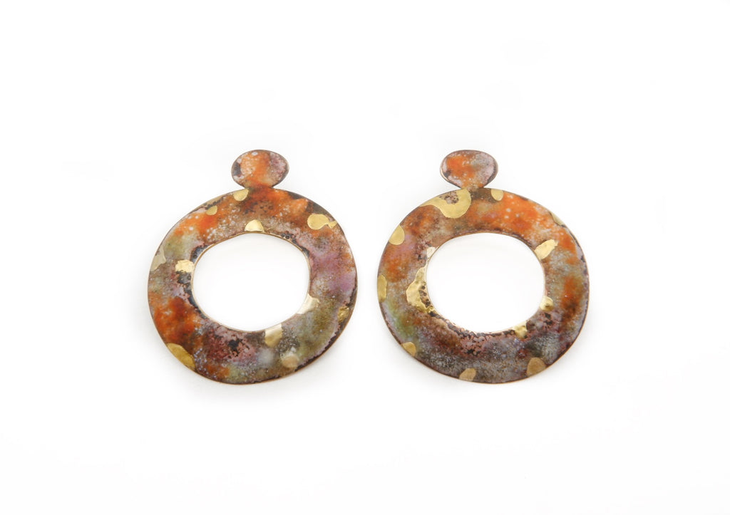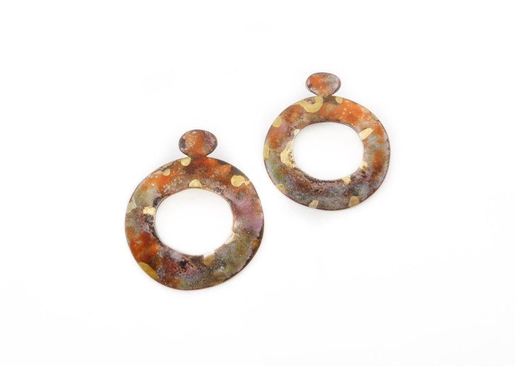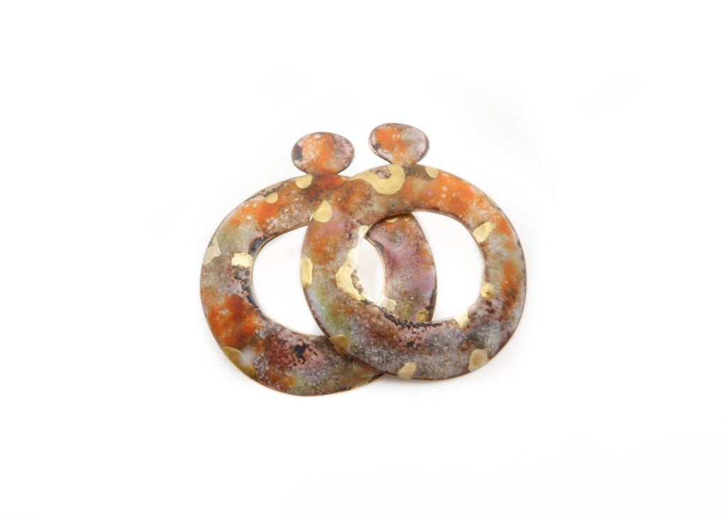Rust loop earrings are inspired by natural textures and the Japanese philosophy of wabi sabi, finding beauty and harmony in asymmetry and worn surfaces. They have a subtly textured surface created by hammering and firing layers of enamel. After being brought to a matte finish, they’re accented with a natural lacquer and then dusted with pure gold or silver powder. To finish, they’re buffed and sealed with matte varnish spray. I enjoy working with simple, sculptural forms, creating timeless and wearable art jewelry.